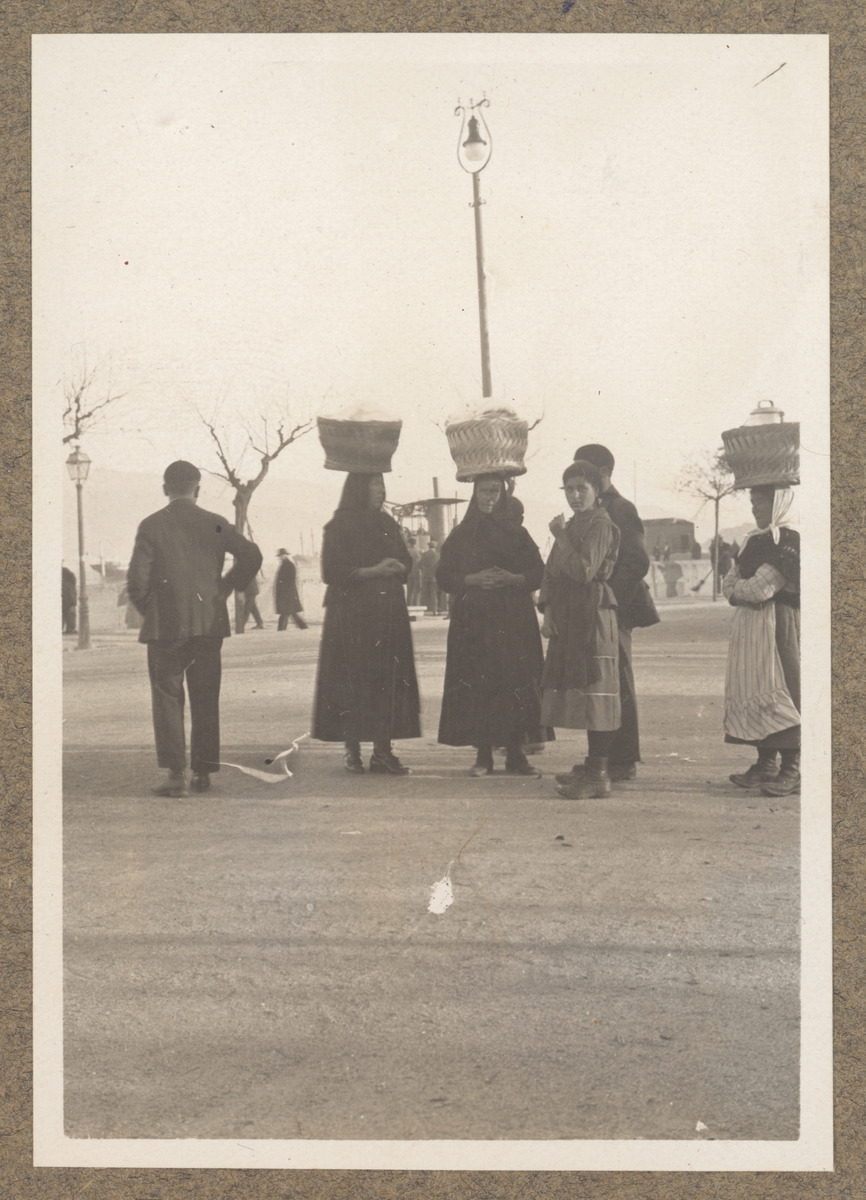 Titel: Bilden visar en grupp kvinnor som bär laster i korgar på huvudet.
