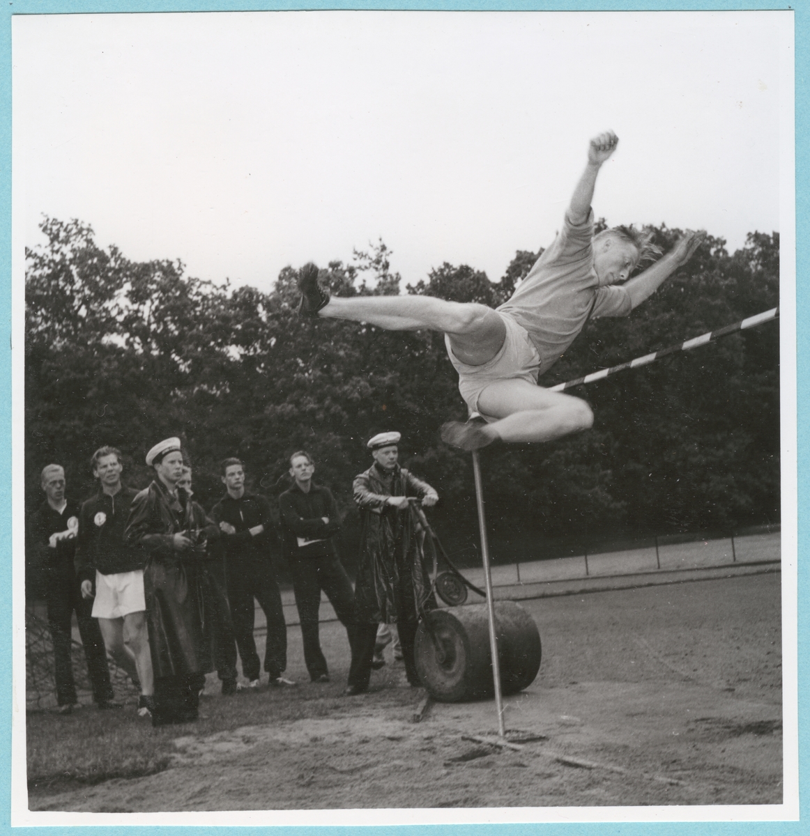 Kadett Moe från Norge hoppar höjdhopp över en stång i en idrottstävling. Vid sidan av står ett antal militära idrottsmän och ser på. Den ena håller i en stor vals som används till att plana ut marken framför höjdhoppsstången. Från Danska och Norska örlogsbesöken den 29/6 - 4/7 1951.