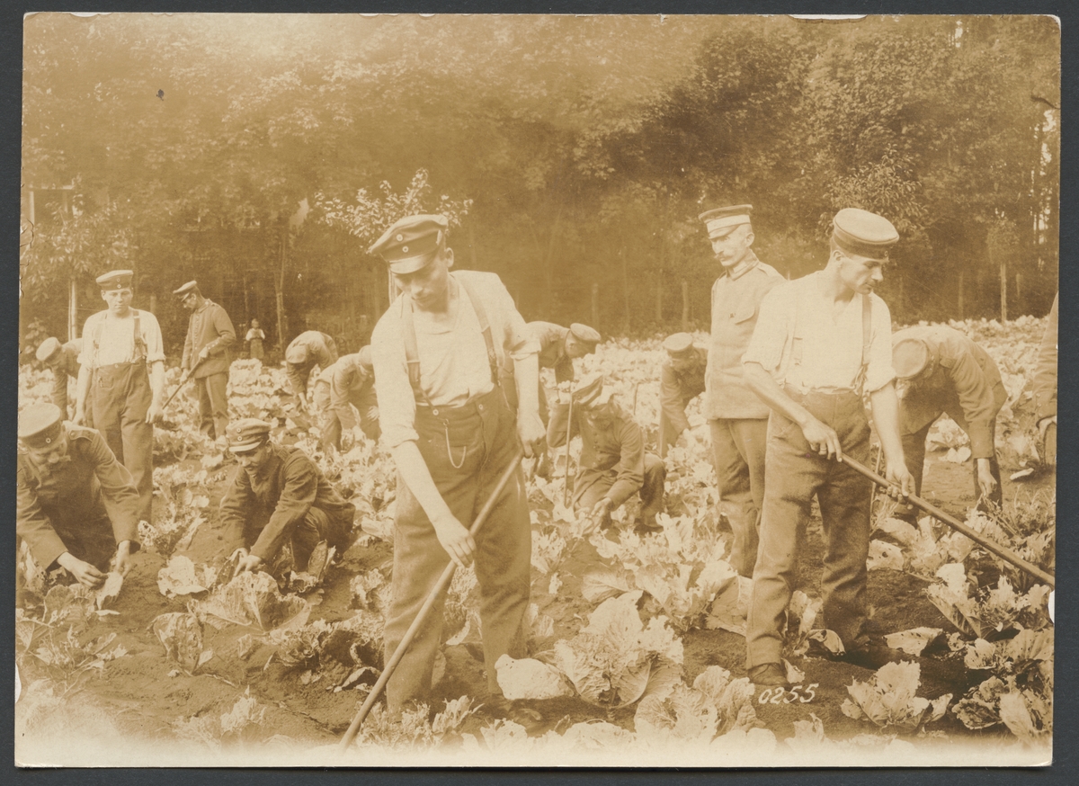 Bilden visar en grupp krigsinvalider som arbetar i en grönsaksodling. Uniformsmössorna avslöjar att de är soldater. En officer håller uppsikt över dem.