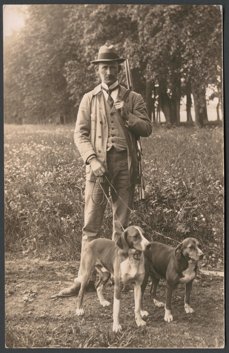 Denna porträtt visar den tyske sjöofficerare Fritz Lembke som poserar som jägare. Han är klädd i jaktdräkt och hat, bär en hagelbössa över axeln och håller hundkoppel till två jakthundar i sin hand.