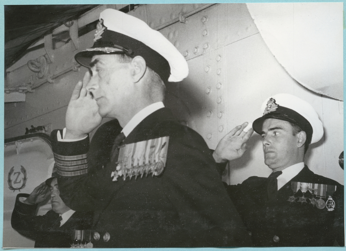 Här hälsas konteramiral Samuelson vid ombordkomsten på H.M.S. Montclare av Chef Captain Hutchinson och officerare. Bilden visar tre engelska militärer som står ombord på ett örlogsfartyg och gör honör. Alla tre är klädda i uniform och mössa. Från Engelska besöket i Karlskrona den 9-14 september 1951.
