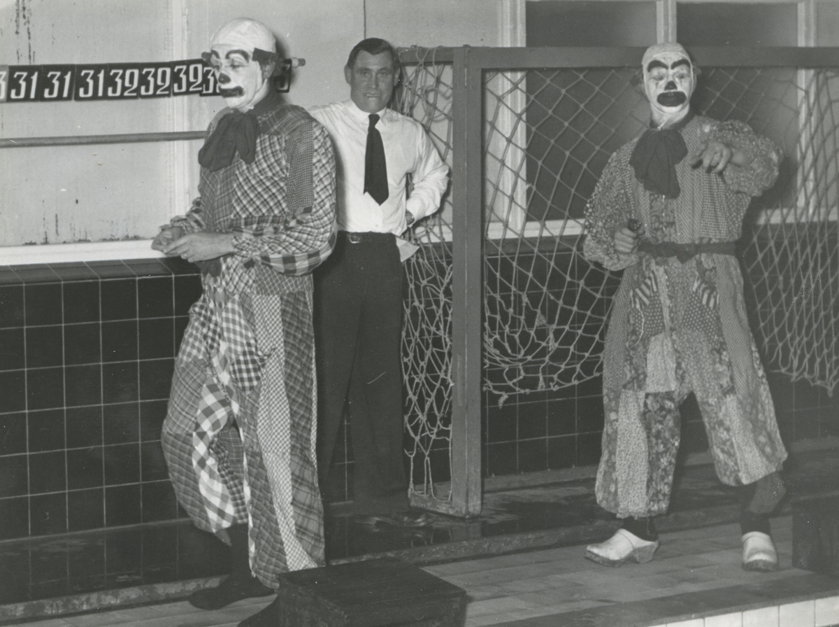 Titel: Två personer utklädda som clowner under teaterscetch. Bakom dem står en man i vit skjorta och slips.