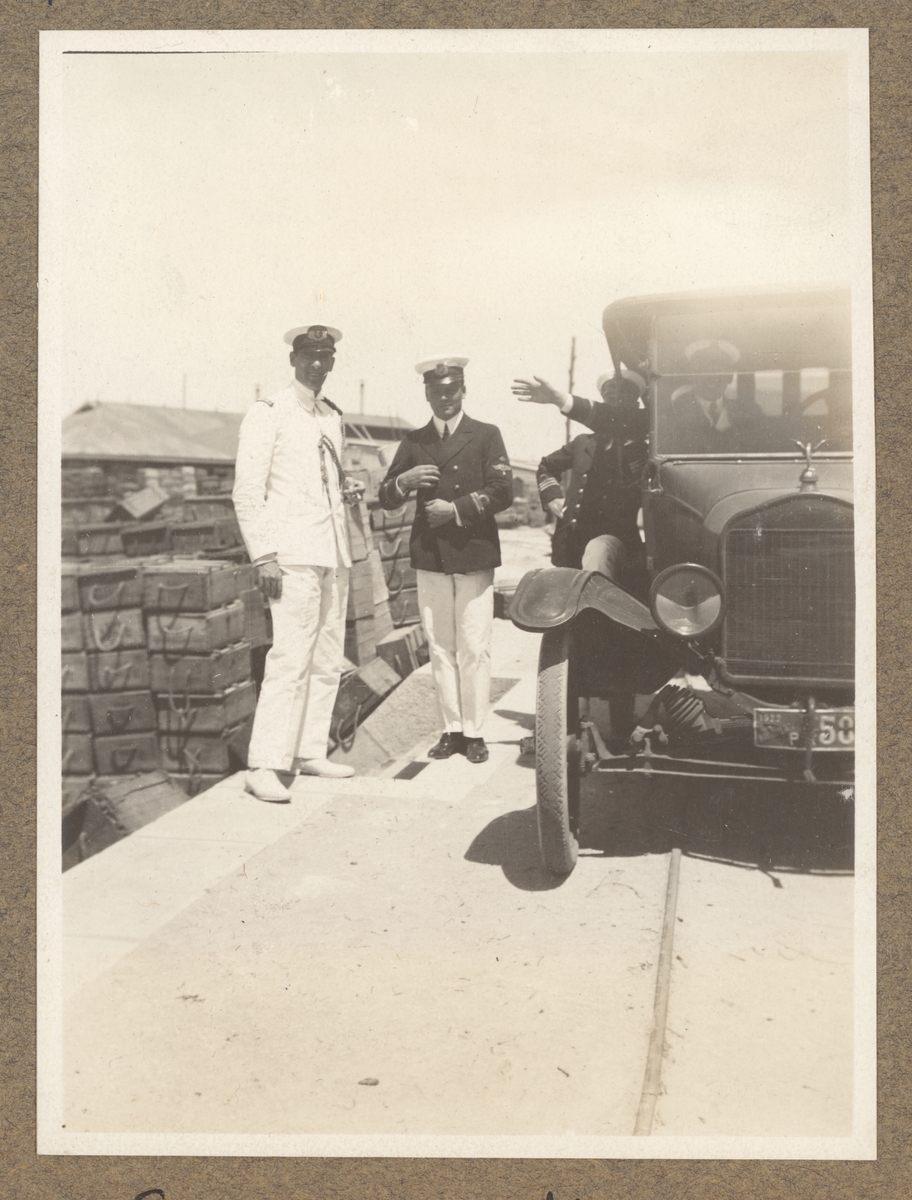 Tre befäl från Fylgia står bredvid en bil. Bakom de finns en stapel med trälådor som ser ut som ammunitionslådor.
