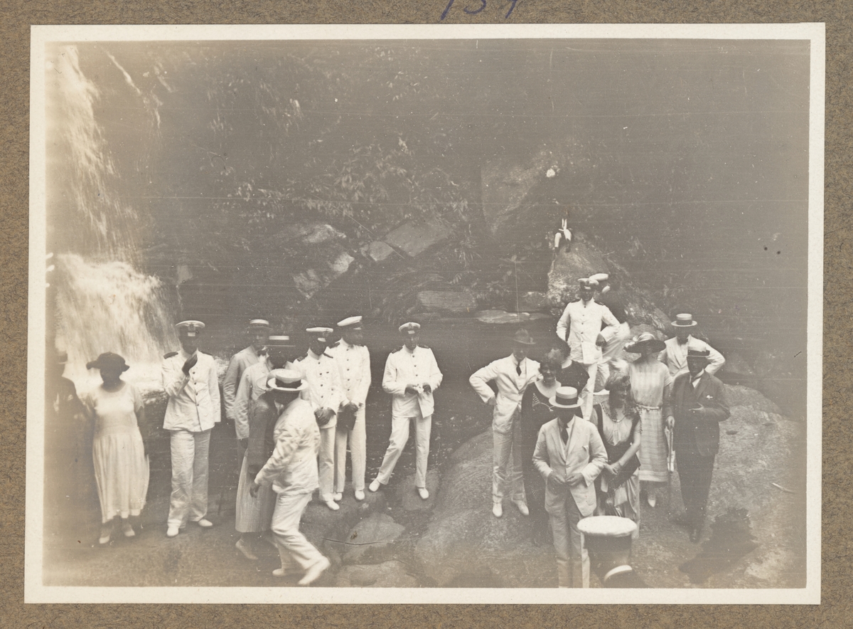 Bilden visar en grupp turister bestående av svenska sjöofficerare i vita uniformer, män i civila kläder och några kvinnor som har tagit uppställning för fotografering inför ett vattenfall.