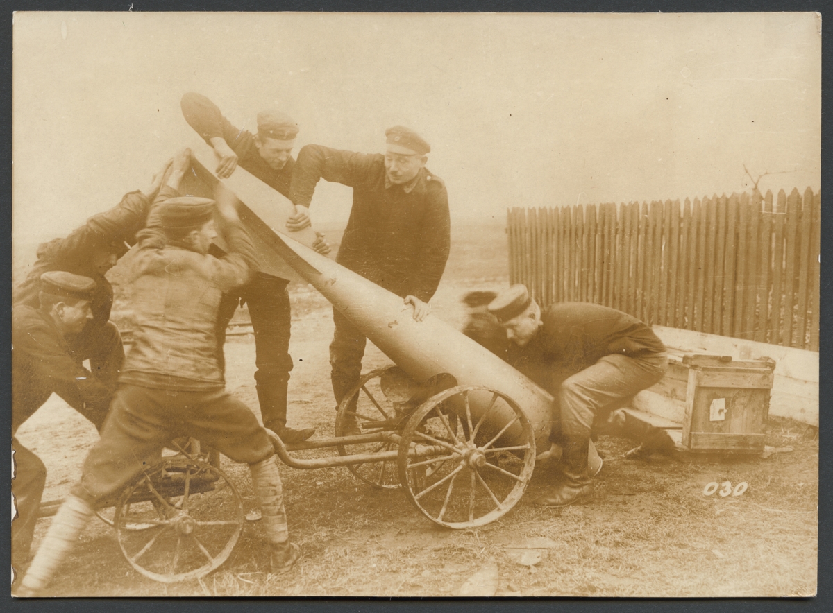 Bilden visar hur sju soldater håller på att lasta en flygbomb på en transportvagn i järn inför transporten till flygplanet.