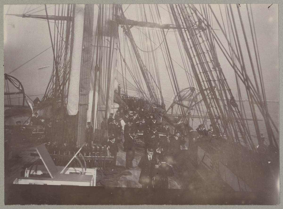 Titel: Manskapet har tagit uppställning vid kanonerna ombord på Balder. En person stiger ombord och hälsar.