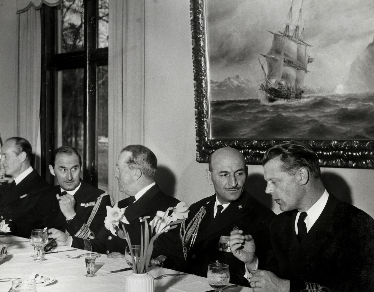 En grupp högt uppsatta militärer äter middag vid ett långbord tillsammans. I bakgrunden syns en tavla på väggen föreställande ett skepp. På bordet står en vas med påskliljor. En av männen som ses samtala med sin bordsgranne är konteramiral Samuelson, tredje från höger.