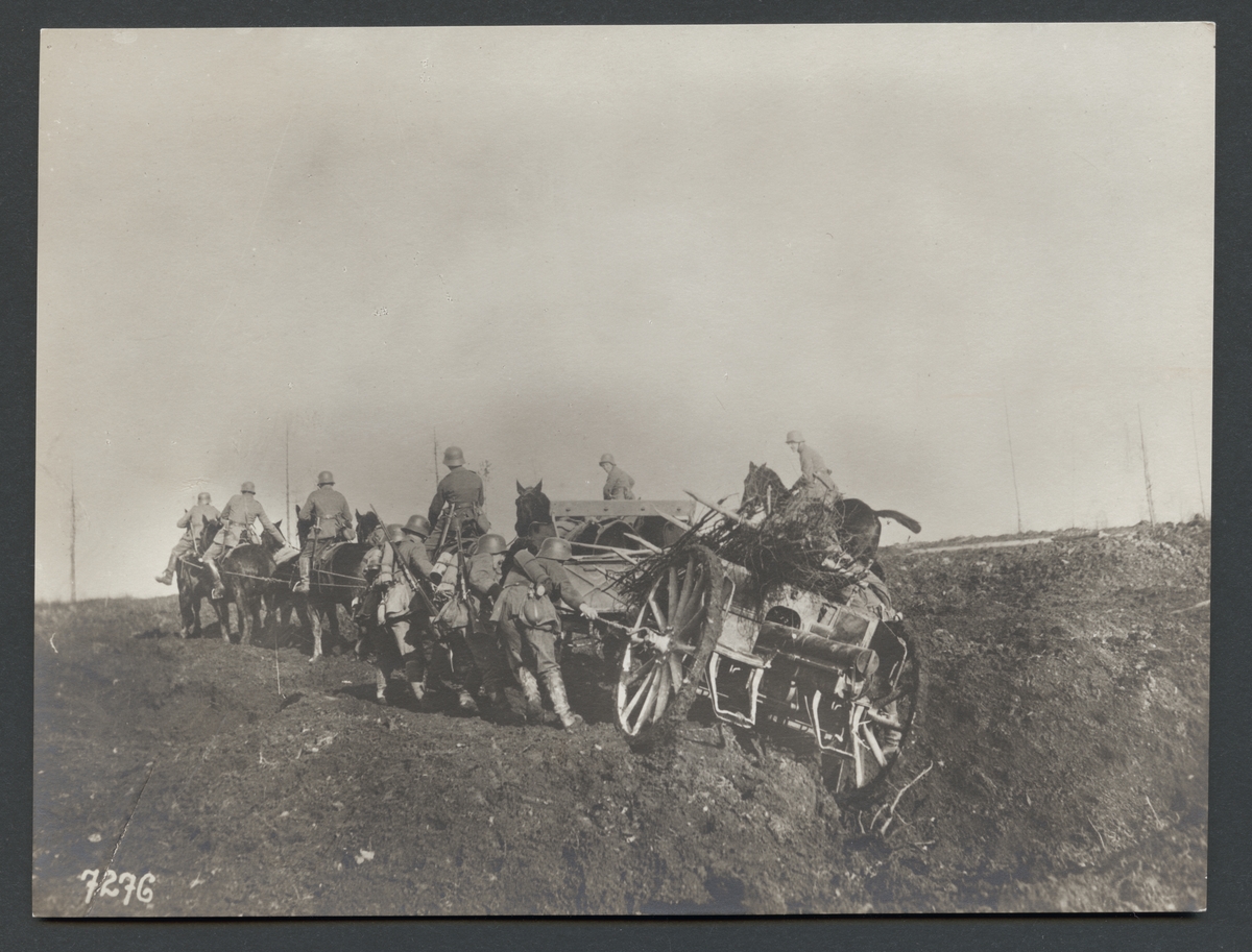 Bilden visar en hästdragen artilleripjäs som dras av en grupp Soldater över en sönderbombad slagfält med bomtratt.