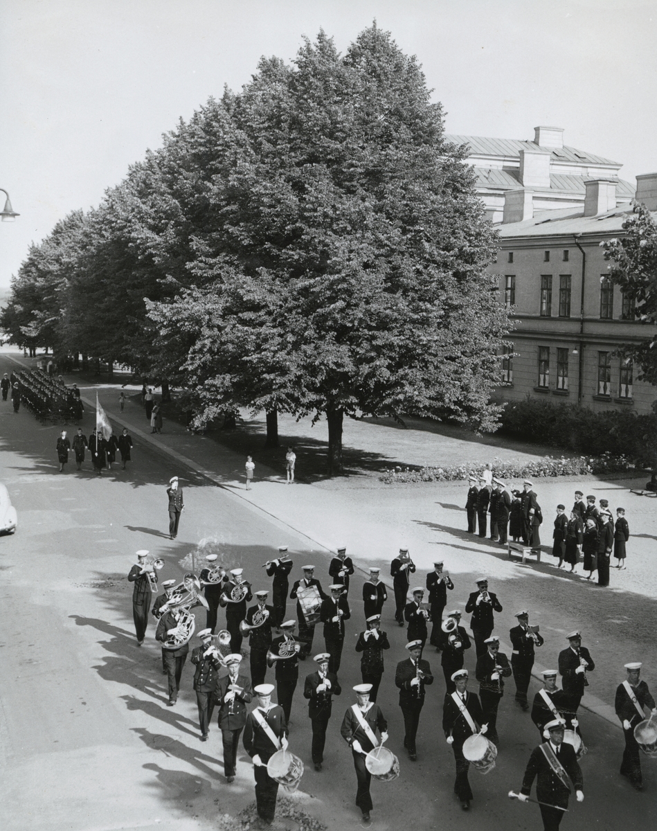 Militär parad med marinenes musikkår i förgrunden längs Vallgatan intill bataljon af Trolle. Längre bak i marschen syns även lottakåren. Till höger i bild syns en grupp militärer och lottor med konteramiral Samuelson på ett podium.