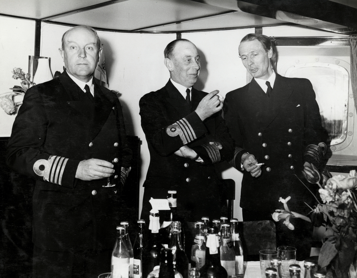 Kommendör Bong står med ytterligare en kommendör samt en kommendör med högre tjänsteställning (som tjänsteförrättande marinkommandochef vid konteramiralens tillfälliga bortovaro) inne i kaptenens hytt på Älvsnabben och dricker drinkar samt konverserar.