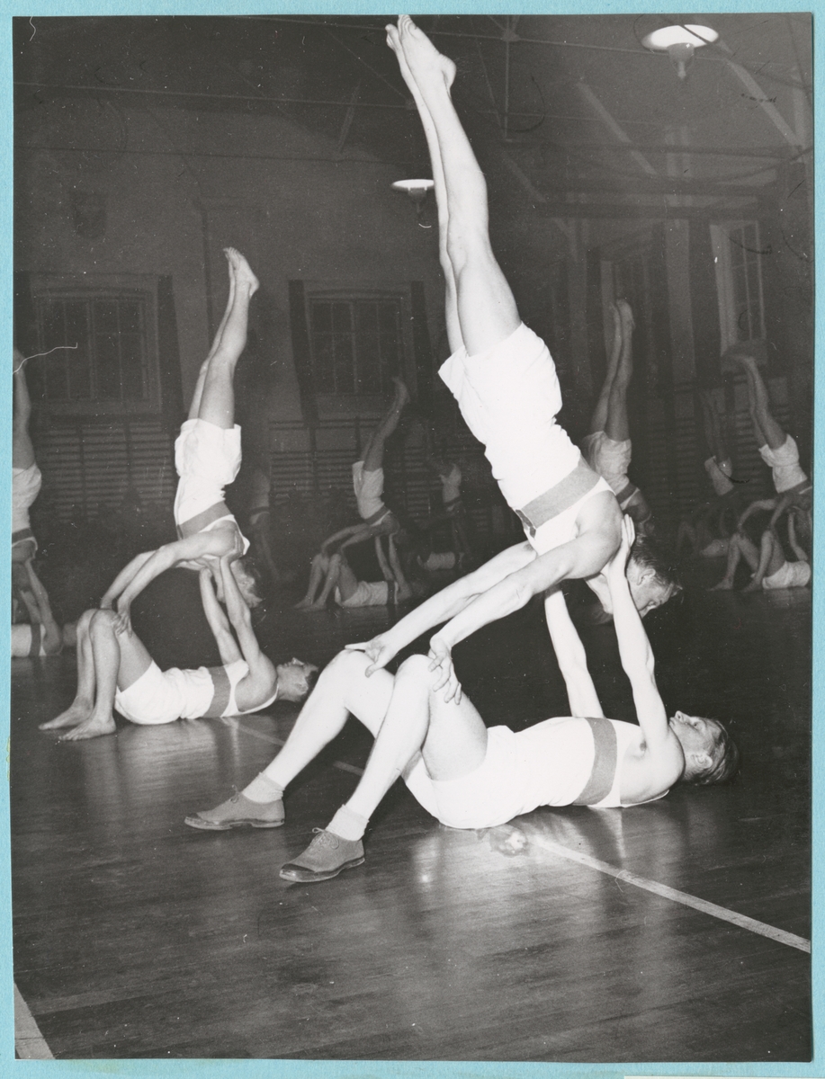 Gymnastikövningar i par i en gymnastiksal. Hälften av männen ligger på rygg på golvet och lyfter upp den andra hälften av mannen genom att hålla i deras axlar. Männen som lyfts upp står uppochner i en loträt vinkel och håller i sig i de liggande männens knän. I bakgrunden syns gymnastikredskap så som ribbstolar och bommar. Samtliga gymnaster är klädda i idrottskläder bestående av shorts och linne.