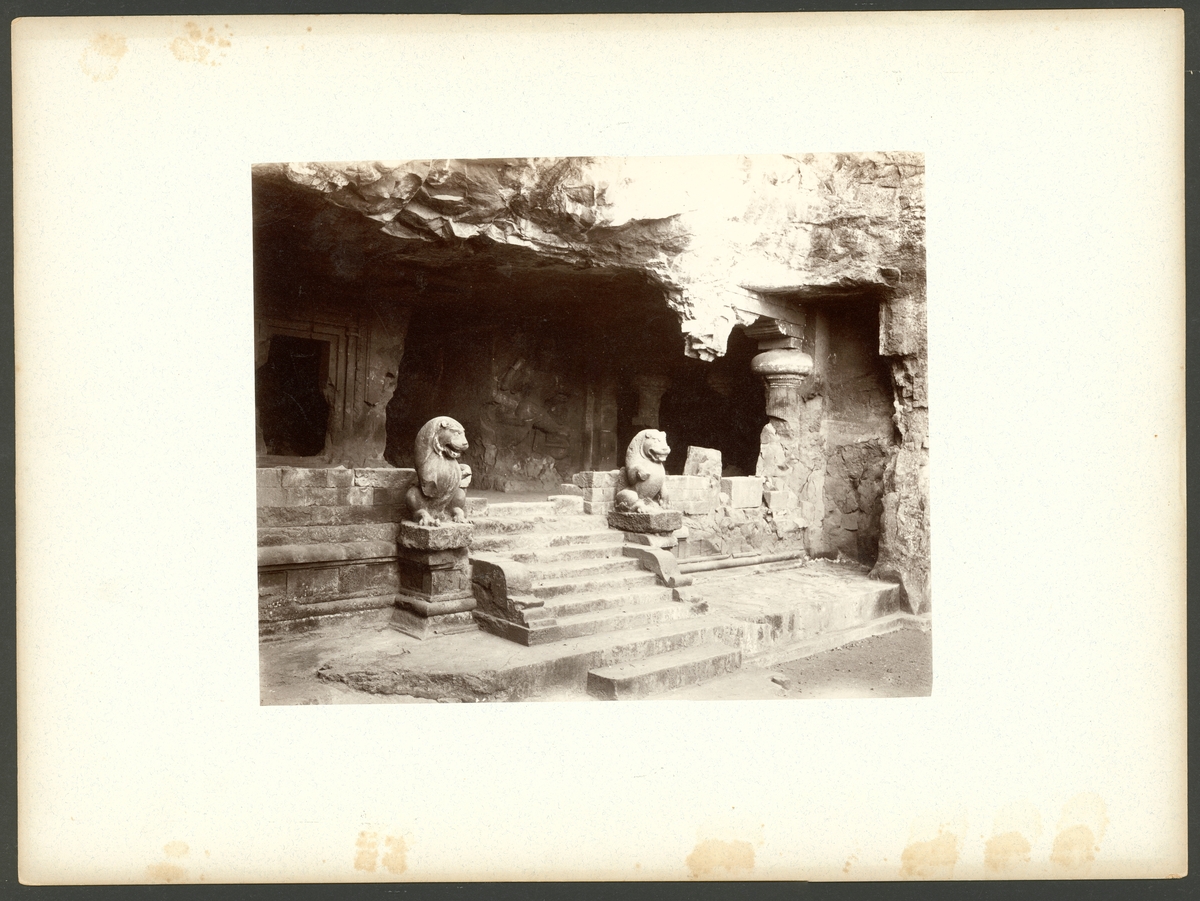 Bilden föreställer ingången till Elephantgrottor på Elephanta ön vid Bombay. I centrumet står två lejonskulpturer.