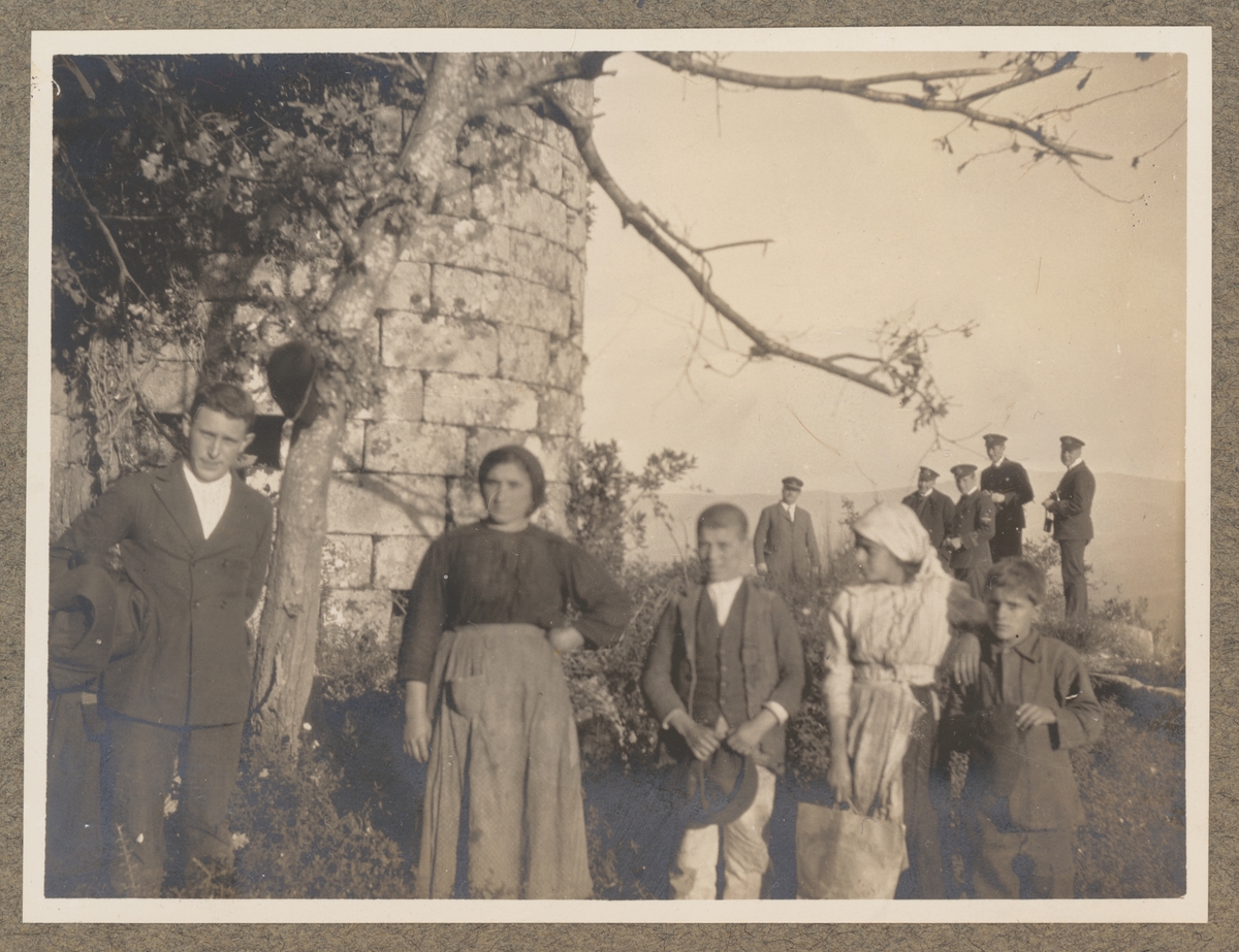 Bilden visar en grupp unga vuxna och barn i enkla kläder som står bredvid en hög mur av grova sten. I bakgrunden syns en grupp sjöofficerare.