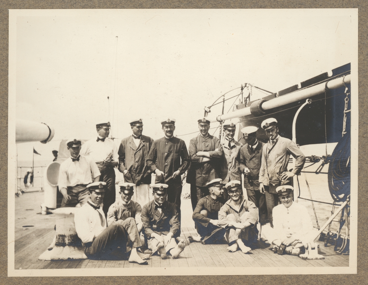 Fylgias befäl har samlats till en gruppfoto ombord på Fylgia. Istället för uniformer bär de enkla arbetskläder. Bilden är tagen i samband med linjedopet.