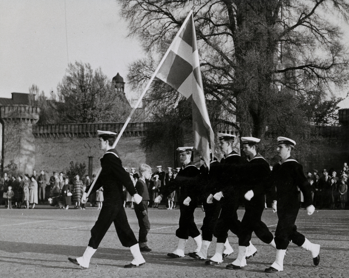 En grupp uniformsklädda flottister, den första med en svensk flagga, marscherar över Stortorget i Karlskrona. I bakgrunden syns vattenborgen och en folksamling som har samlats för att titta på marschen.