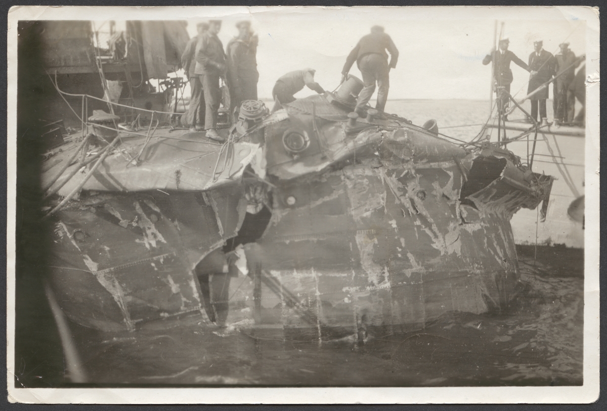 Bilden visar förskeppet av jagaren Vidar efter sammanstötningen med jagaren Wachtmeister. Skeppets förstäv är stark intryckt och sönder riven. Flera sjömän undersöker skadorna.