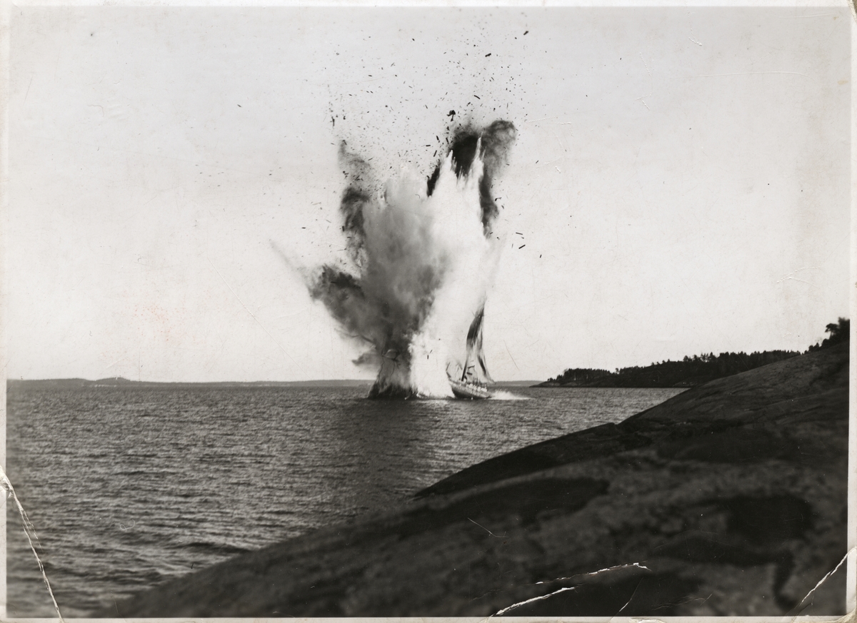 Fotot visar sprängning av fartyg. Explotionen orsakar ett stort moln av rök blandat med delar av båten. I förgrunden och bakgrunden syns klipphällar, hav och klar himmel.