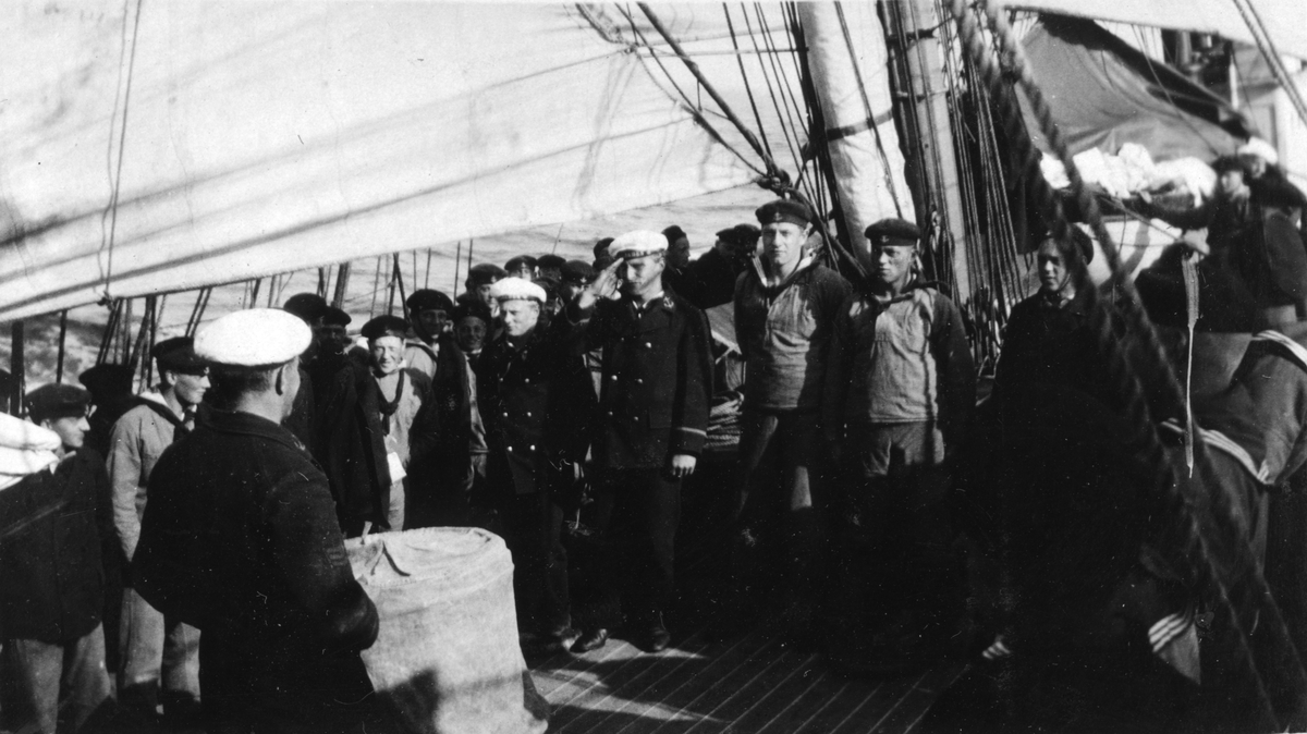 Titel: Avlämning i stationen. Sjömännen gör honmör på båtsdäck.
