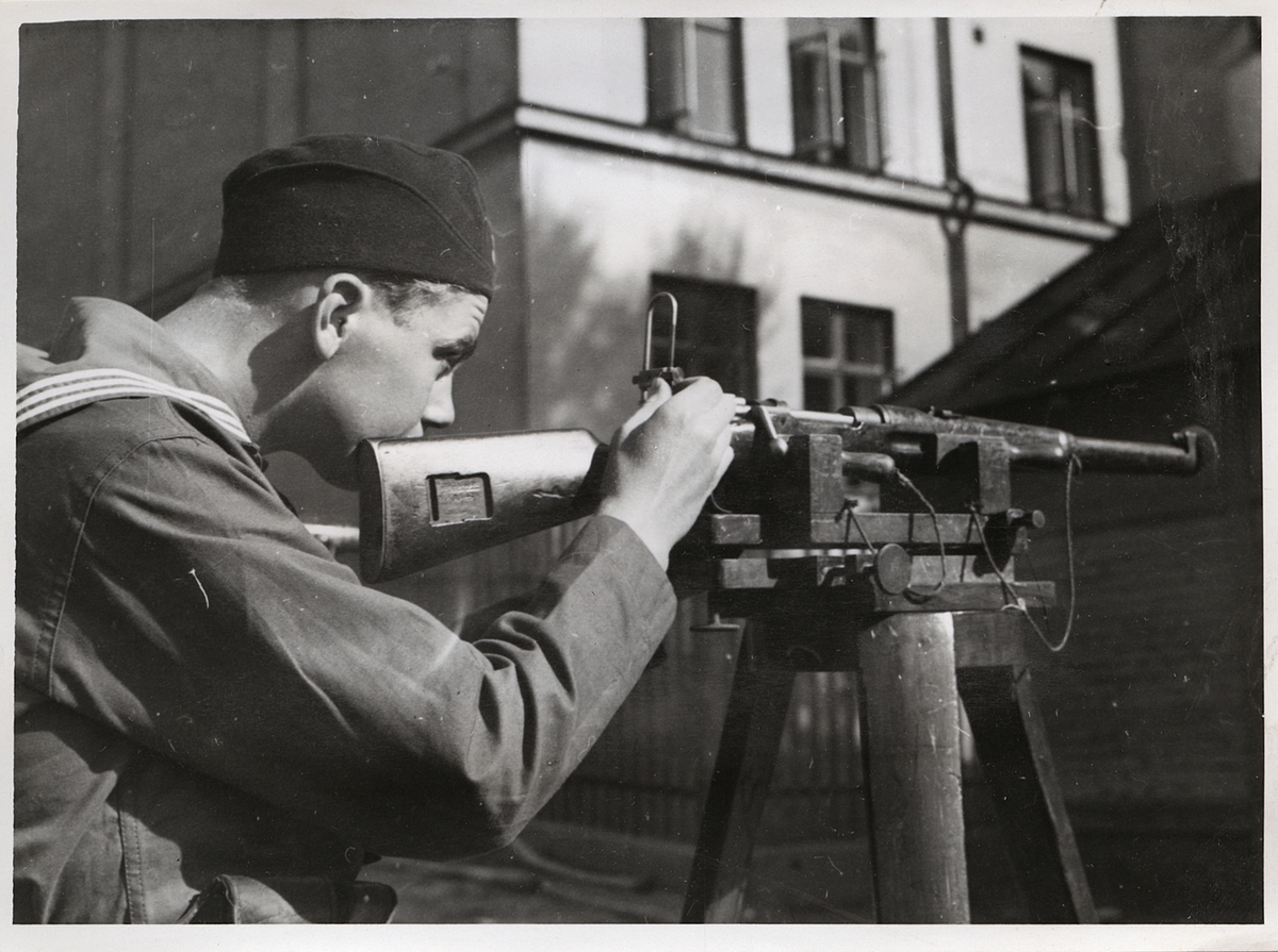 Bilden visar en ung man som ställer in siktet på ett gevär. Hans ansikte ses i profil och är till cirka en tredjedel dolt bakom gevärets kolv. Han är koncentrerad på det han gör och han har lagt pannan i djupa veck. Mannen bär en sjömansuniform komplett med krage och mössa. Han är placerad i bildens omedelbara fokus i förgrunden och i bakgrunden ses en fasad till en byggnad som torde vara en del av ett kasernområde.