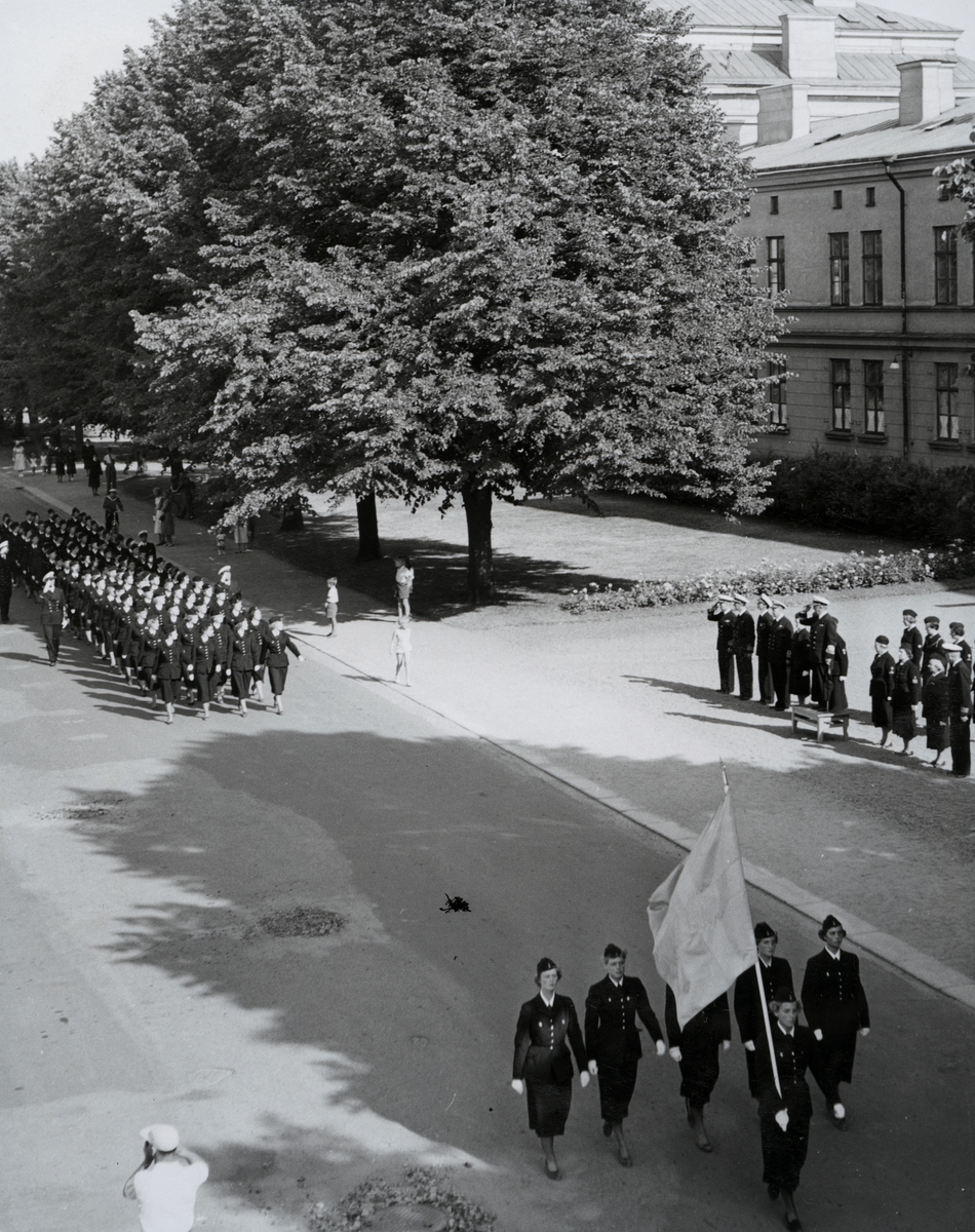 Uniformsklädda lottor marscherar längs med Vallgatan utanför Bataljon af Trolle i Karlskrona. Utanför bataljonen står bl.a. en konteramiral och gör honör.