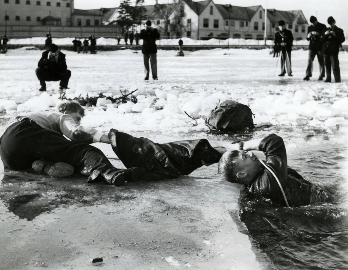 Värnpliktig man ligger i isvak med rep runt midjan. En av hans vänner drar i repet och hjälper honom upp. I bakgrunden står andra personer och bevittnar det hela med kamera i hand.