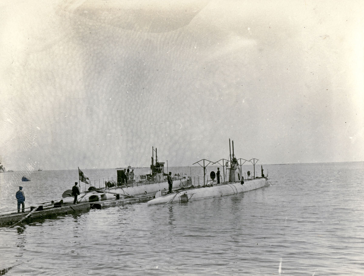 Till vänster ubåten HVALEN och till höger den italienska ubåten FOCA. Ombord FOCA syns en ställning för suntält. Båda ubåtarna byggdes vid det italienska varvet Fiat-San Giorgio i La Spezia.