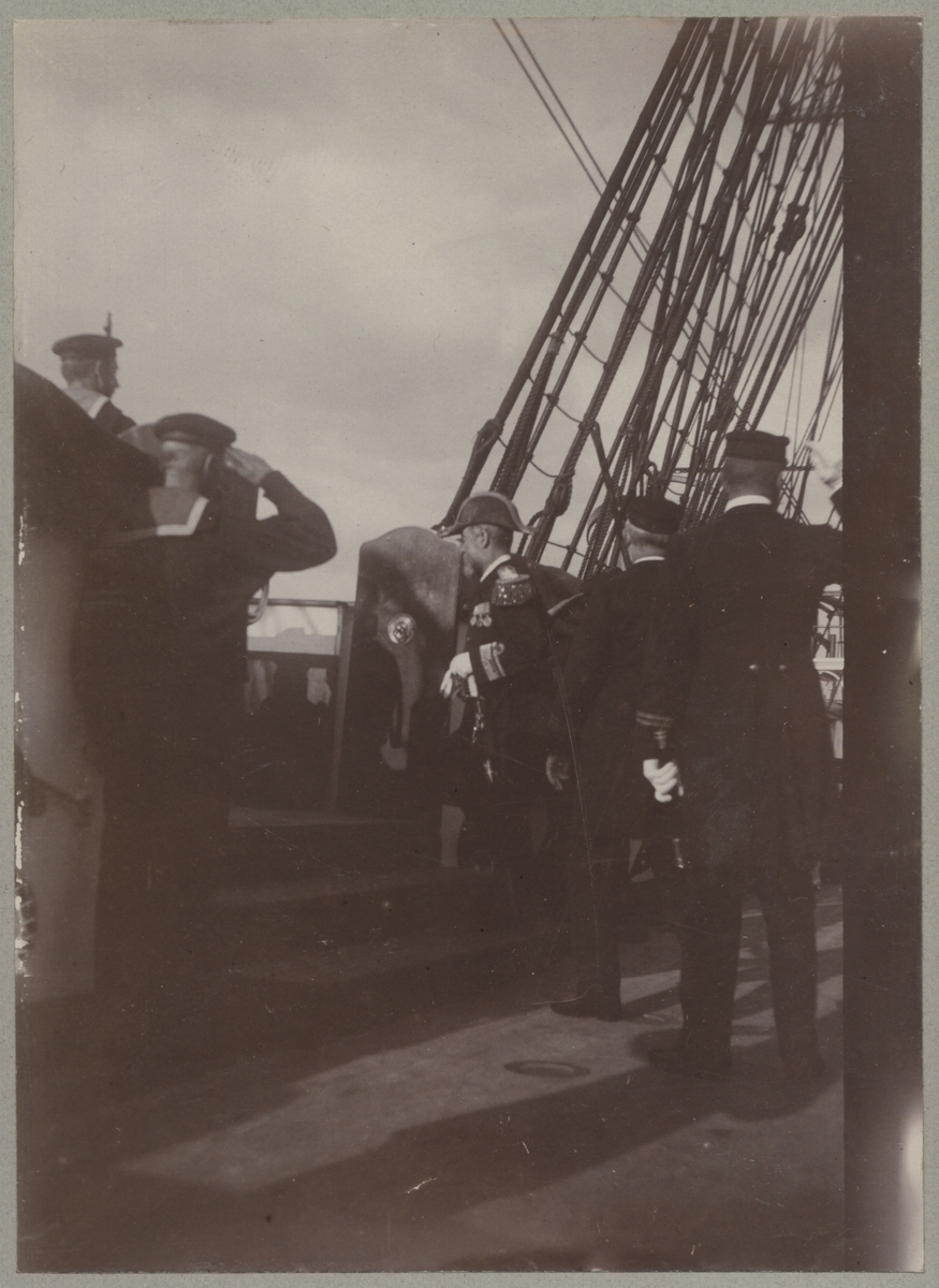 Titel: Befäl och manskap hälsar på en utländsk sjöofficerare som håller på lämnar fartyget.