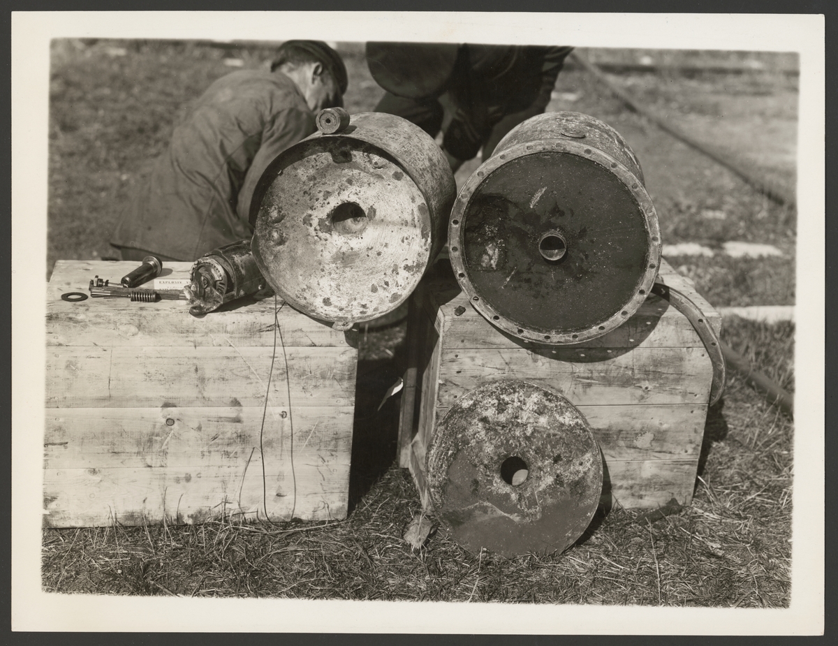 Bildserie som dokumenterar desarmeringen av en tysk tillverkad sjunkbomb som hittades 1936 vid Hasslö av besättningen från trålaren "Försten.