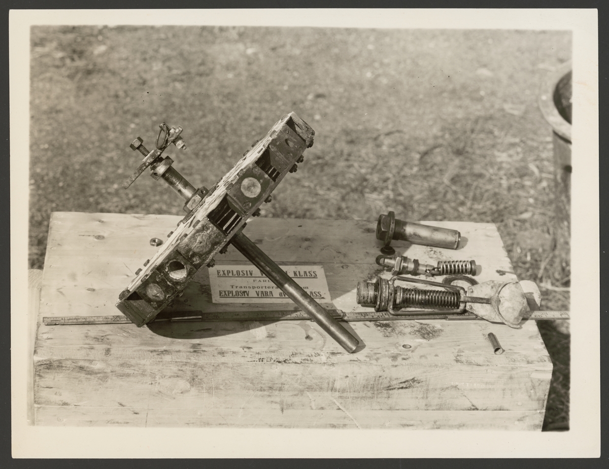 Bildserie som dokumenterar desarmeringen av en tysk tillverkad sjunkbomb som hittades 1936 vid Hasslö av besättningen från trålaren "Försten.