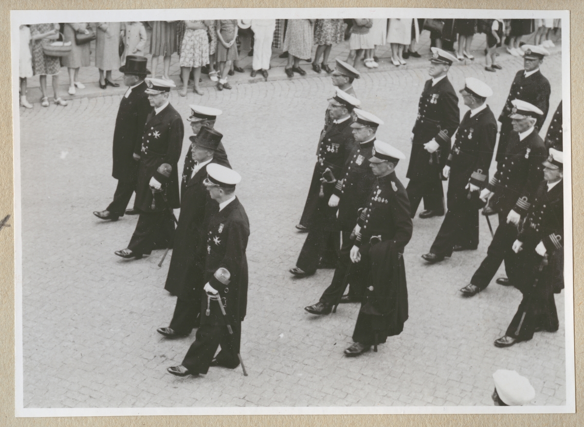 Bilden visar jordfästningen av sex av offren från ubåten Ulven fredagen den 6. augusti 1943 i Fredrikskyrkan. Officiant Ehmgård, organist Murgård, Kungl. Flottans musikkår, dirigent Harry Olsson.
