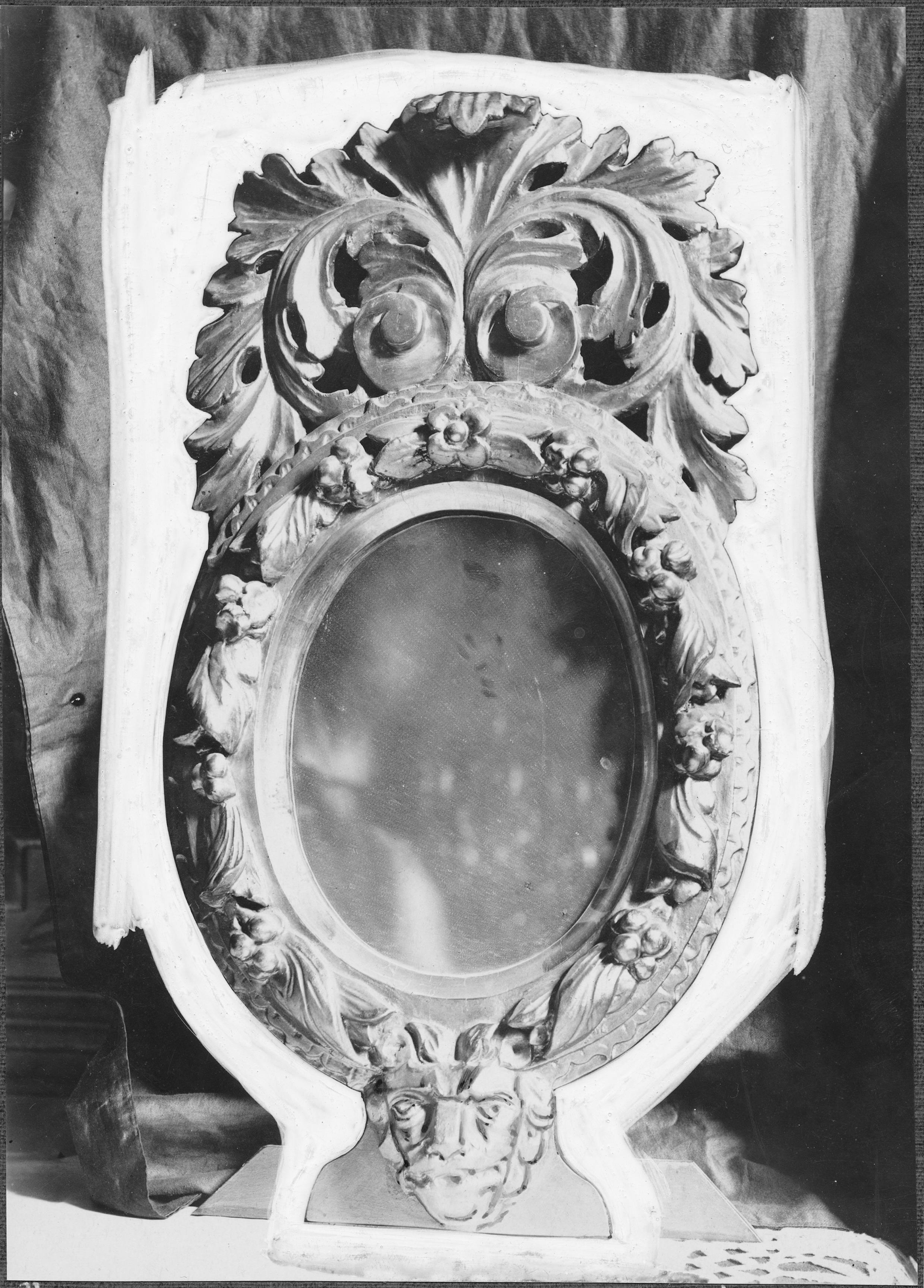 Beskrivning: Spegel, förgylld, rikt snidad ram. Gåva av Karl XV. 1600-talet.