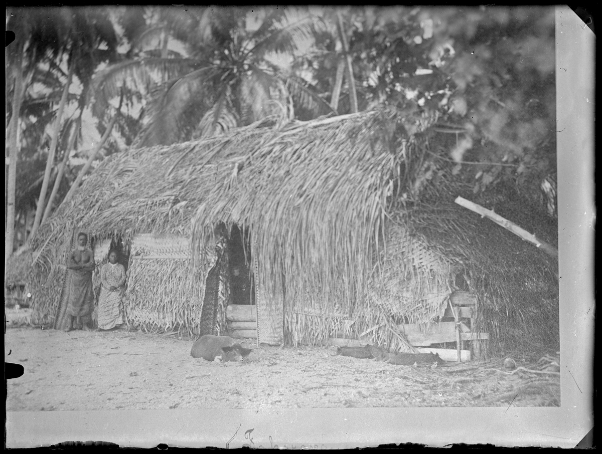 Bilden föreställer far och dotter framför sin hydda i skogen på Fakarava.