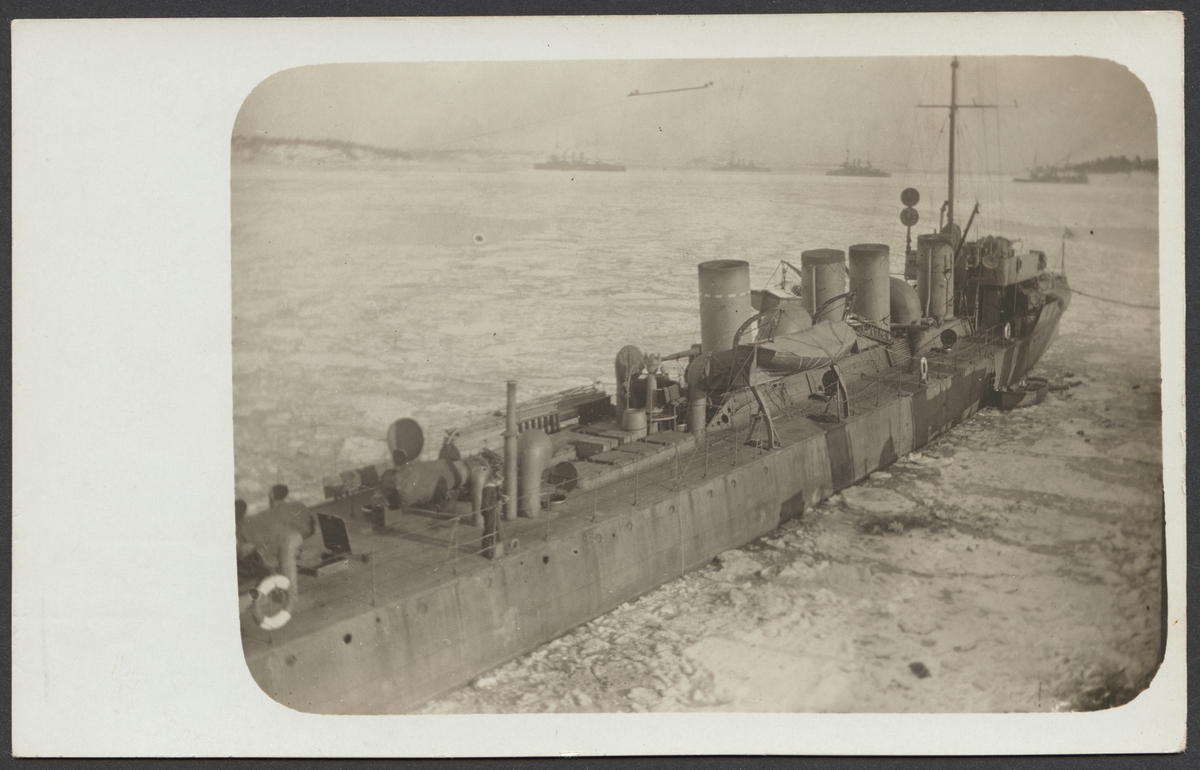 Vykort som visar Sveriges första jagare Mode till ankars i en istäckt hav. Fartyget fotograferades från en förhöjd position sned bakifrån från styrbordssidan. Intill förskeppet ligger en skeppsbåt förtöjt. I bakgrunden syns ett förband större örlogsfartyg, förmodligen pansarskepp och kanonbåtar ,framför en skärgårdskust.