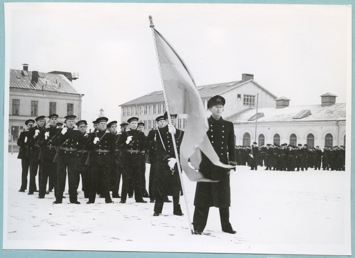 En grupp uniformsklädda flottister står uppställda på bataljon Sparres snötäckta kaserngård. Längst fram står en löjtnant med en flagga i ena handen. Kaserngården omgärdas av matinrättningen och exercishuset. Längs med exercishusets fasad står flera grupper av flottister uppställda.