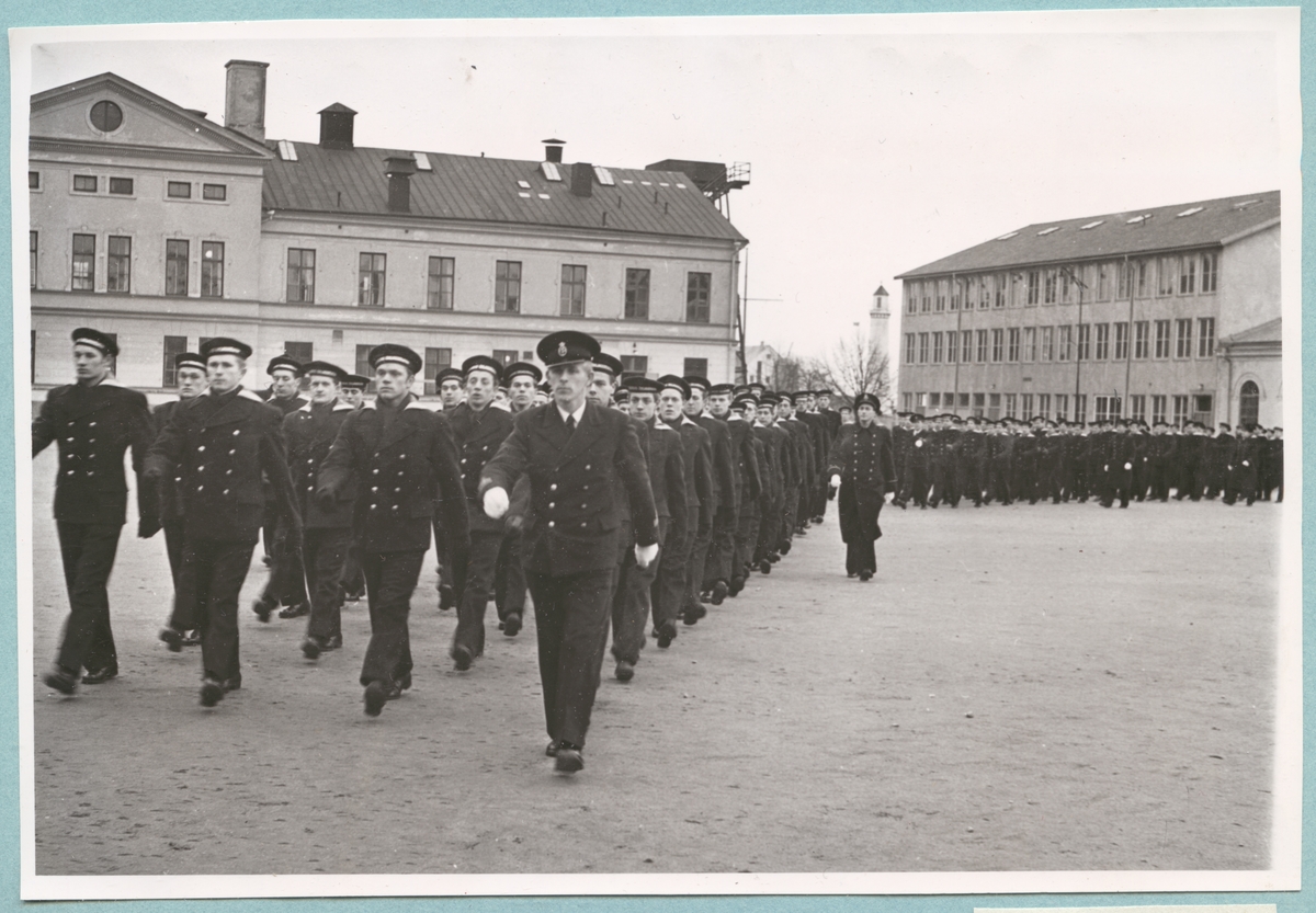 En grupp flottister och militärer ur flottan marscherar på bataljon sparres kaserngård. I bakgrunden syns byggnader som hör till bataljonen.