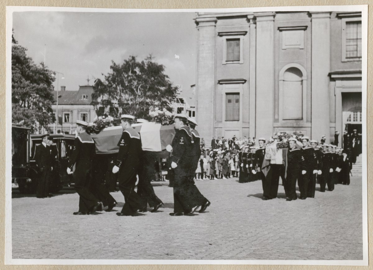 Titel: Bilden visar jordfästningen av sex av offren från ubåten Ulven fredagen den 6. augusti 1943 i Fredrikskyrkan. Sjömän bär likkistor ut ur kyrkan.