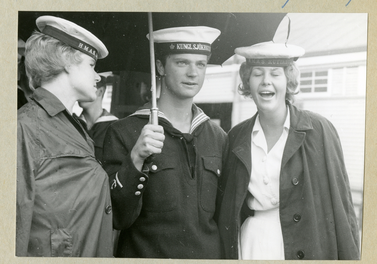 Bilden föreställer två kvinnor som står på varsin sida om kronprinsen Carl Gustaf, som är klädd i uniform och håller i ett paraply. De omgivande damerna är från HMAS Kuttaburra, en australisk marin utbildningsenhet. (HMAS = Her Majesty's Australian Ship).