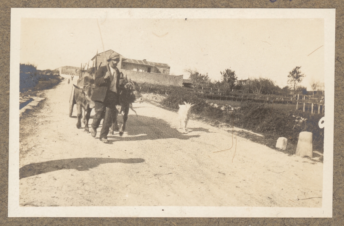 Titel: Bilden visar en bonde som leder en oxvagn. Bredvid de syns en get och i bakgrunden bondgården.