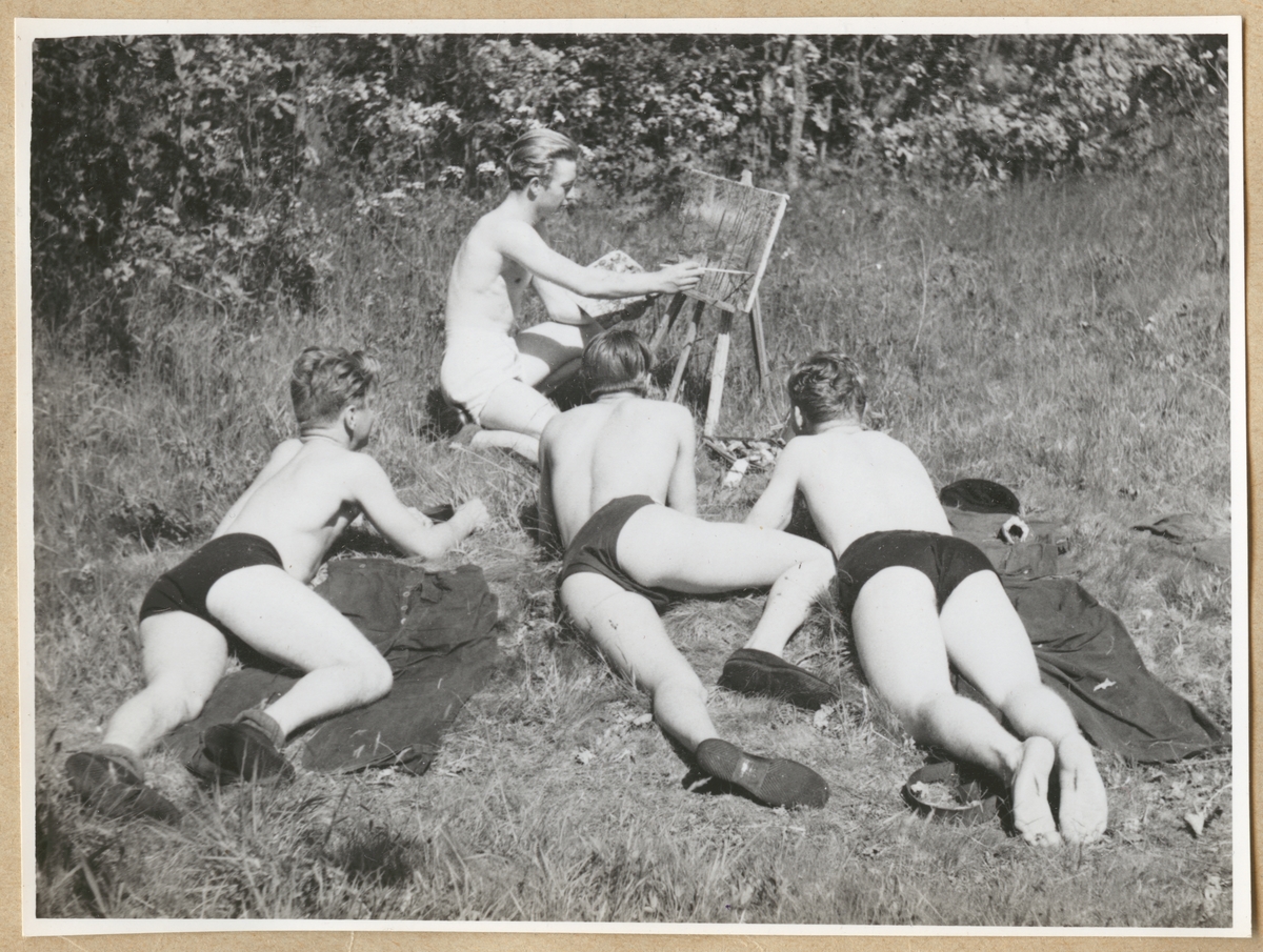 En ung man sitter på marken ute i naturen, stödd på ett knä, och målar på en canvas, vilken står på ett staffli. Framför honom i bilden ligger ytterligare tre unga män på mage i gräset. Männen är enbart klädda i shorts eller badbyxor och använder sina kläder som liggunderlag.