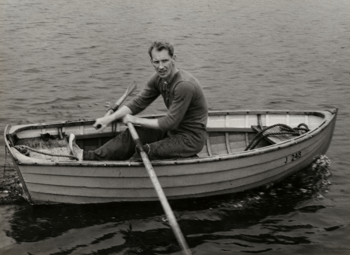 Man i liten roddbåt på havet, han håller i åror och tittar förbi fotografen.