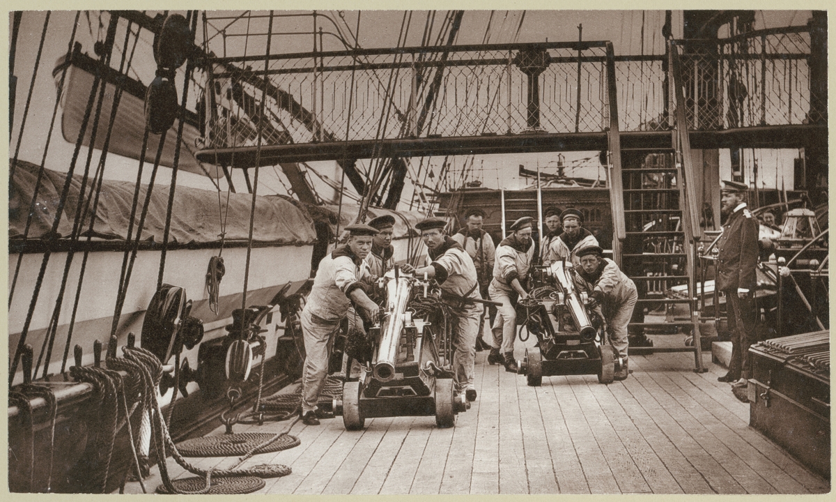 Bilden förställer tyska sjömän ombord på korvetten Stosch som drillas i hanteringen av kanoner på däcket. Här utförs kommandot för att transportera pjäsen på däcket.