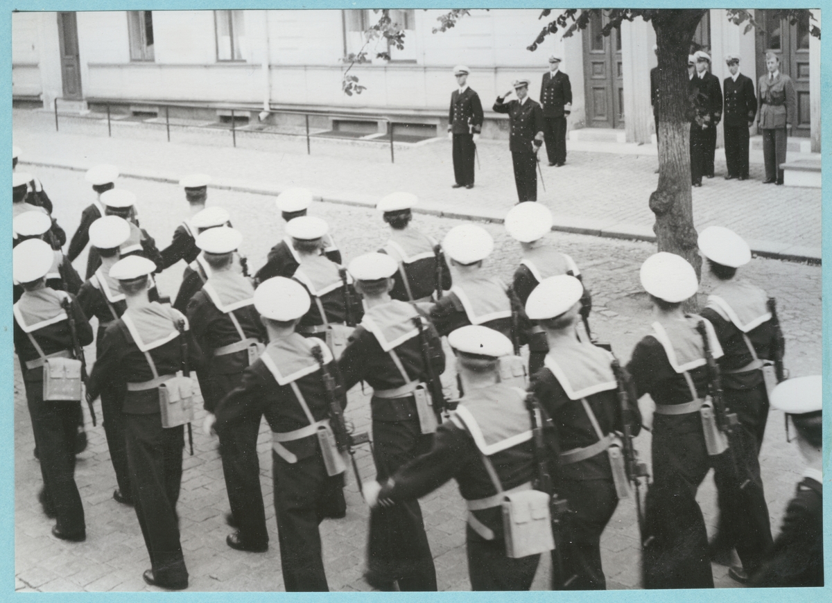 Uniformsklädda flottister marscherar på drottninggatan, förbi Bataljon Sparre där en grupp högt uppsatta militärer står givakt, i spetsen konteramiral Samuelson som gör honnör.