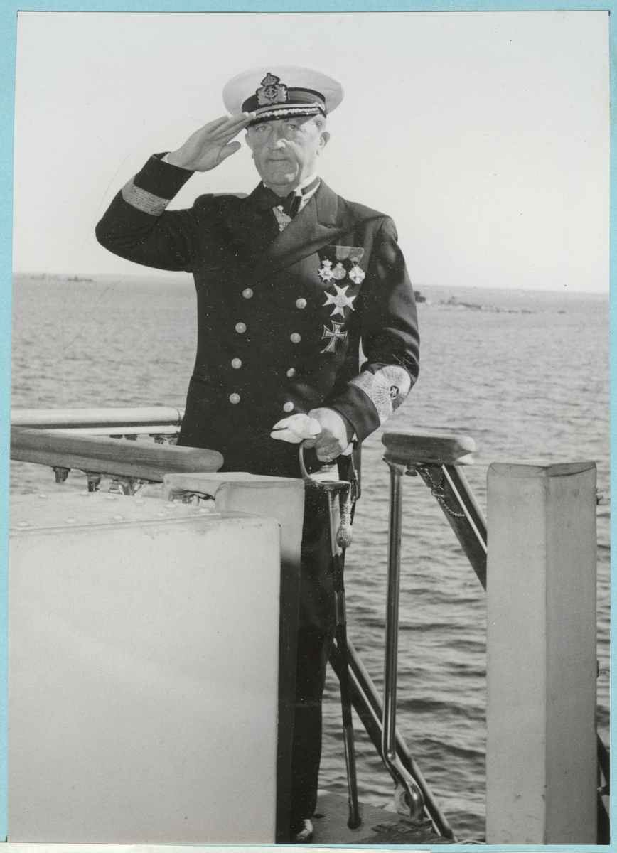 Konteramiral Samuelson går ombord på H.M.S. Montclare. Han står på däck och gör honnörhälsning med skärgården i bakgrunden. Från Engelska besöket i Karlskrona den 9-14 september 1951.