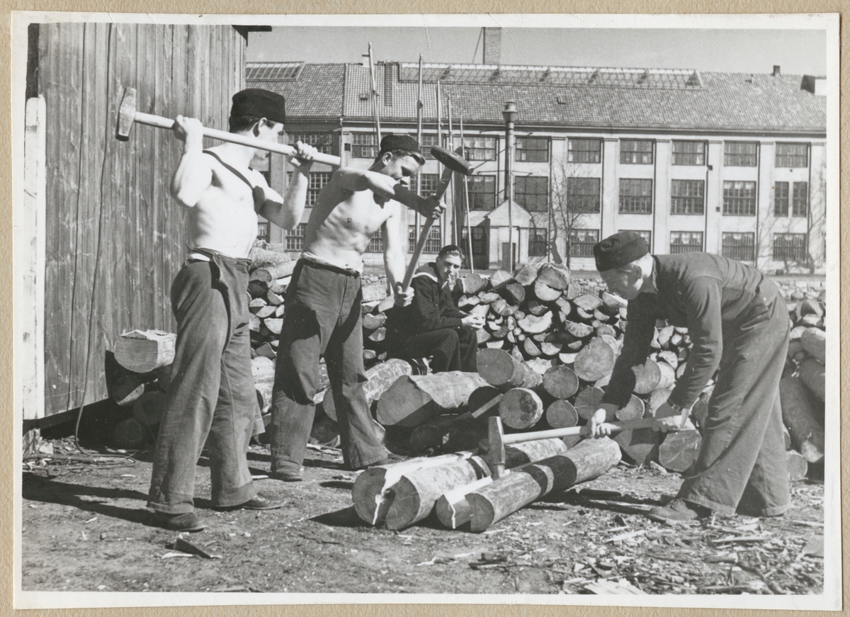 Tre män står med arbetskläder och hugger med släggor på en kil som klyver en stock. Bakom dem finns en stor samling trädstockar. Där sitter även en flottist med en cigarett i munnen. I bakgrunden syns Beklädningsverkstaden på Stumholmen.