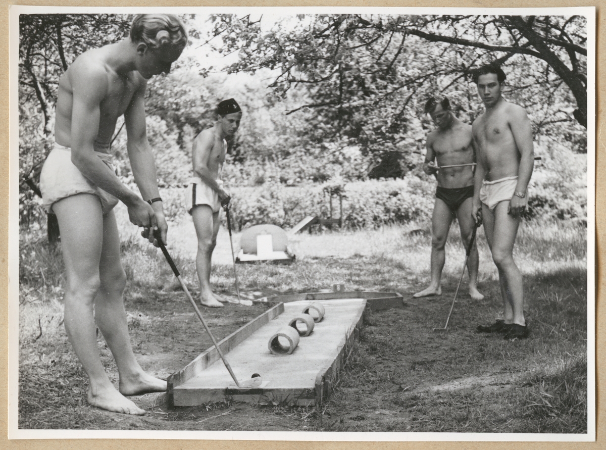 Fyra unga män i shorts står kring en minigolfbana med golfklubbor i händerna. Mannen närmast kameran är i färd med att slå ett slag med klubban. En av männen har en militärmössa på huvudet. Golfbanorna omges av grönskade träd och gräs.