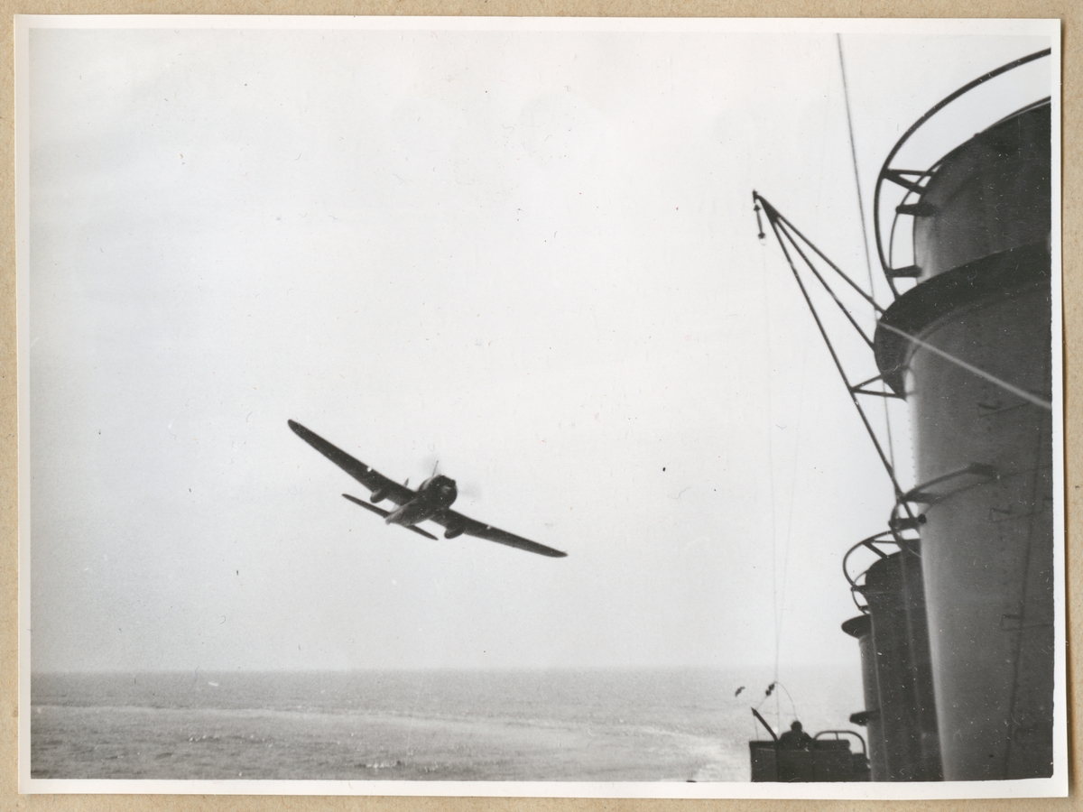 Propellerflygplan syns flyga över himlen intill ett fartyg som fotografen tar bilden på. Fartygets skorstenar skymtar till höger i bild. En del av havet syns och spåren i vattnet indikerar att fartyget är i rörelse.