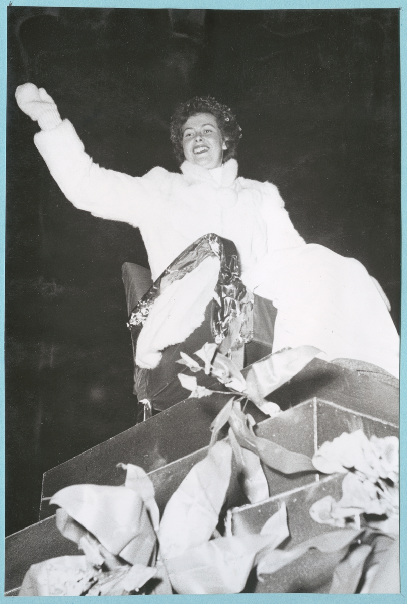 Titel: Karlskrona stads Lucia sitter i en fåtölj och vinkar. Hon har på sig en ljus kappa och tumvantar.