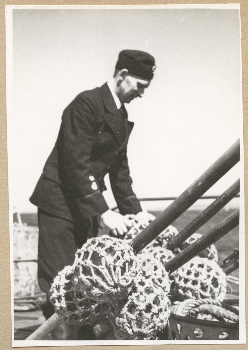 Titel: En uniformsklädd militär står framåtlutad över en samling glasflöten.