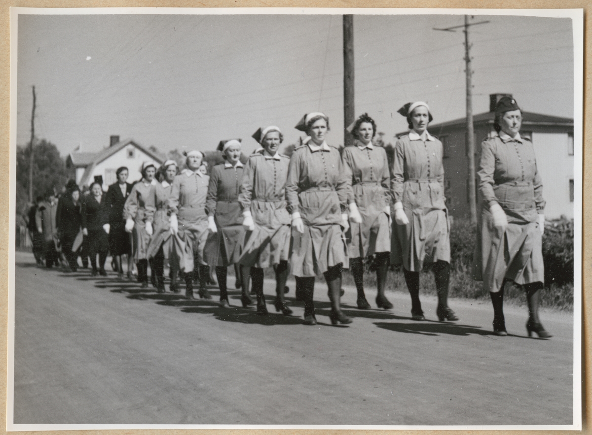 Titel: Uniformsklädda lottor marscherar längs med en gata kantad av villabebyggelse och telefonledningar.