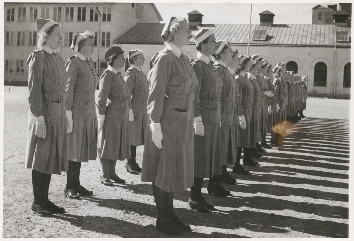 Titel: Uniformsklädda kvinnor från lottakåren står uppställda i två rader inne på Bataljon Sparres innegård.